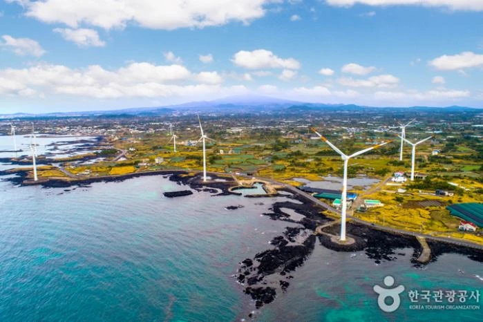 제주도 서쪽 끝을 따라 연결된 신창 풍차 해안도로는 해상풍력단지가 조성되어 있어 해안도로를 따라 줄지어 서 있는 풍차를 만날 수 있다. 구불구불 해안선을 따라 보이는 하얀 풍차와 에메랄드빛 바다는 우리에게 상쾌한 가을 풍경을 보여준다. 자료출처 : 대한민국 구석구석(http://korean.visitkorea.or.kr) 펜션에서 7.8km, 차량으로 약 12분